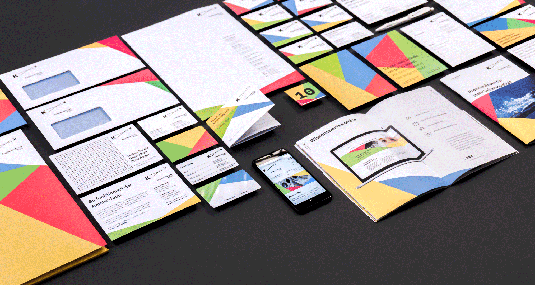 Entstanden ist ein unverwechselbares und speziell auf das Augenzentrum Klatt zugeschnittenes Erscheinungsbild, welches eine gute Orientierung und Vertrauen schafft. Die modularen Gestaltungselemente, wie die kräftigen Farben in großen polygonen Flächen, die klare und stabile Groteskschrift sowie die emotionale Bildwelt bilden eine Einheit, die ausreichend Kontrast bietet und aktivierend wirkt. Sympathisch und kompetent tritt das Augenzentrum seinen Patient*innen gegenüber. Die Gestaltung zieht sich durch alle Bereiche vom Brillenpass bis zum Leitsystem, von der Website bis zur räumlichen Gestaltung des Gebäudes.