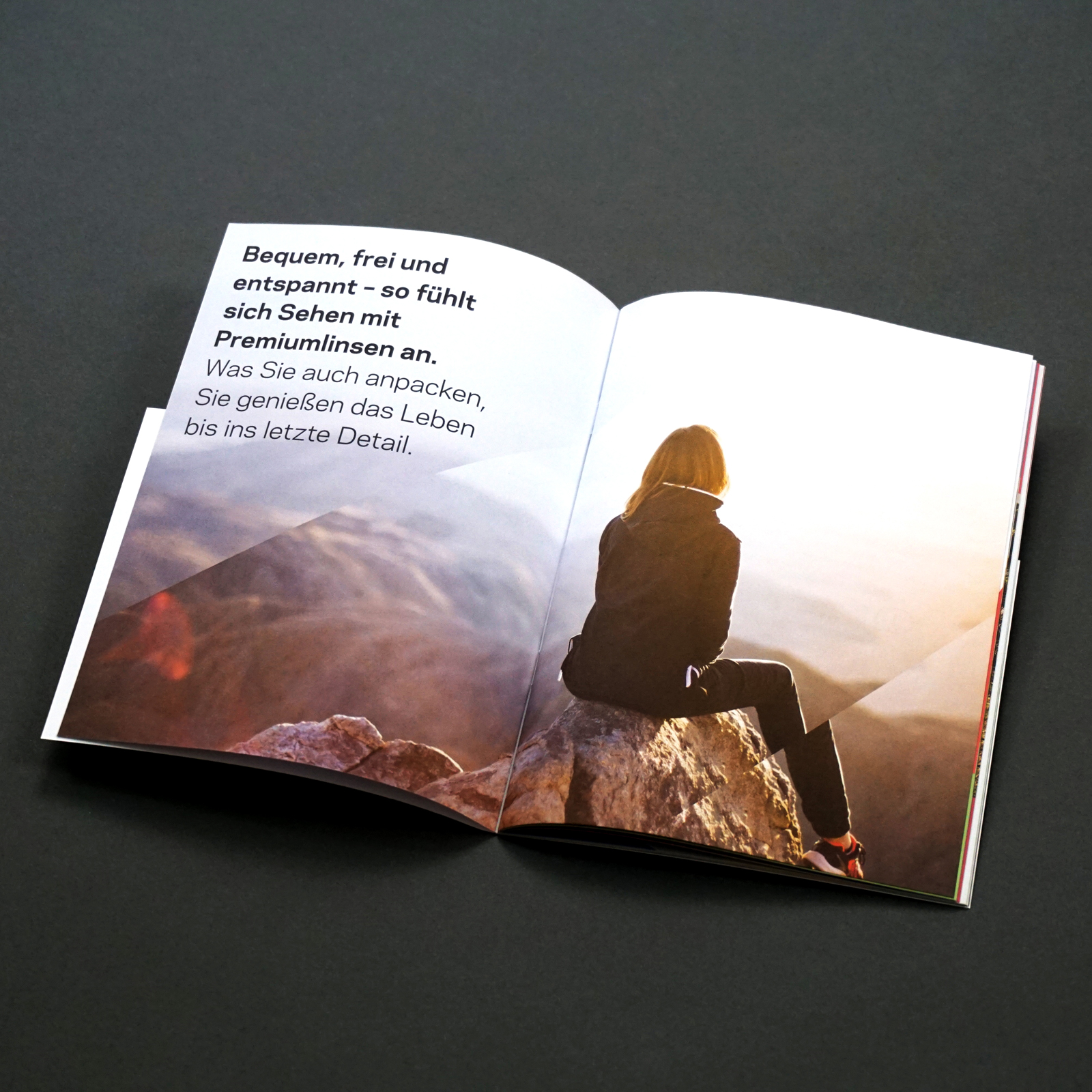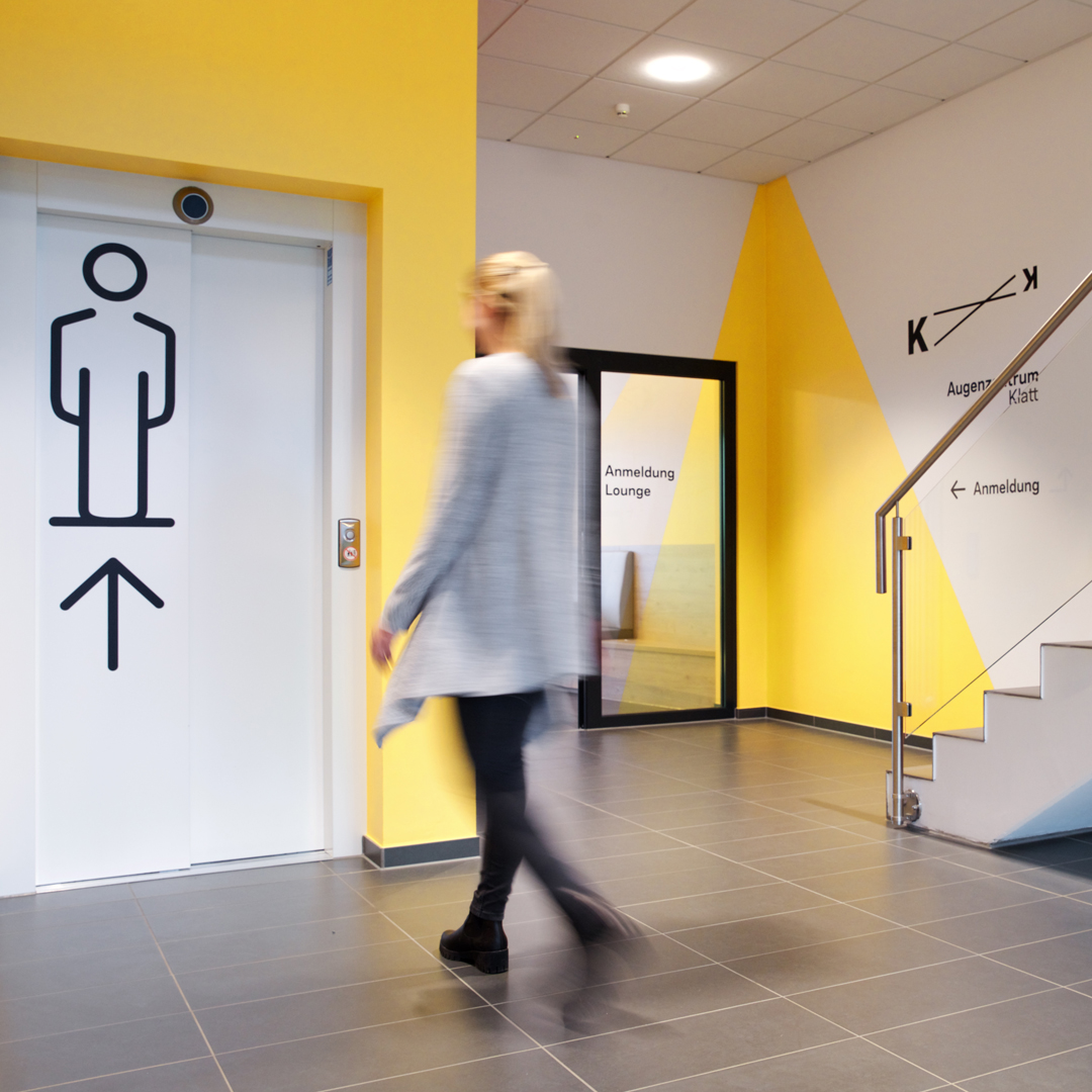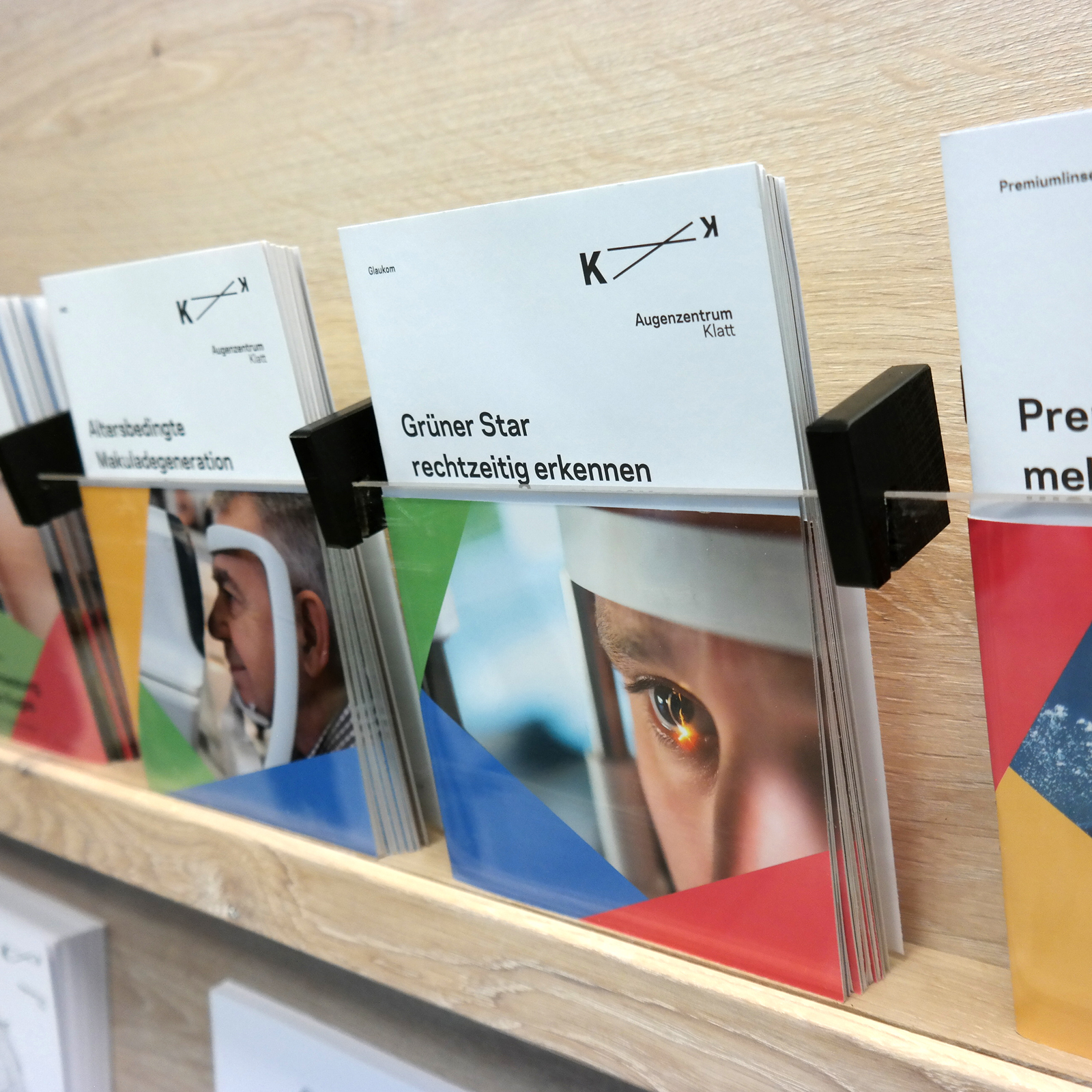 Entstanden ist ein unverwechselbares und speziell auf das Augenzentrum Klatt zugeschnittenes Erscheinungsbild, welches eine gute Orientierung und Vertrauen schafft. Die modularen Gestaltungselemente, wie die kräftigen Farben in großen polygonen Flächen, die klare und stabile Groteskschrift sowie die emotionale Bildwelt bilden eine Einheit, die ausreichend Kontrast bietet und aktivierend wirkt. Sympathisch und kompetent tritt das Augenzentrum seinen Patient*innen gegenüber. Die Gestaltung zieht sich durch alle Bereiche vom Brillenpass bis zum Leitsystem, von der Website bis zur räumlichen Gestaltung des Gebäudes.