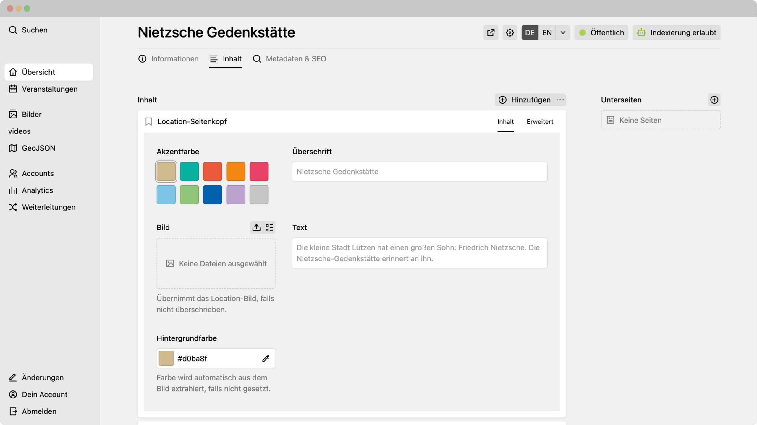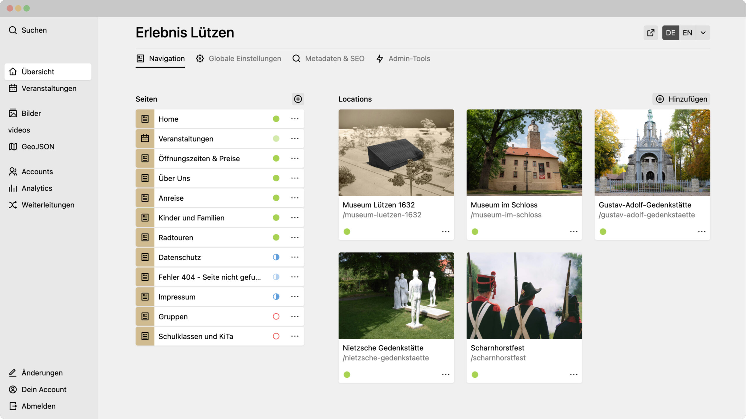 Erstes und wichtigstes Medium für die Kommunikation der neuen Tourismusmarke »Erlebnis Lützen« ist die Website. Bei der technischen Entwicklung setzen wir auf das CMS »Kirby« und bieten damit den Redakteur*innen, welche die Website betreuen, eine sehr anwendungsfreundliche und störungsfreie Arbeitsumgebung.