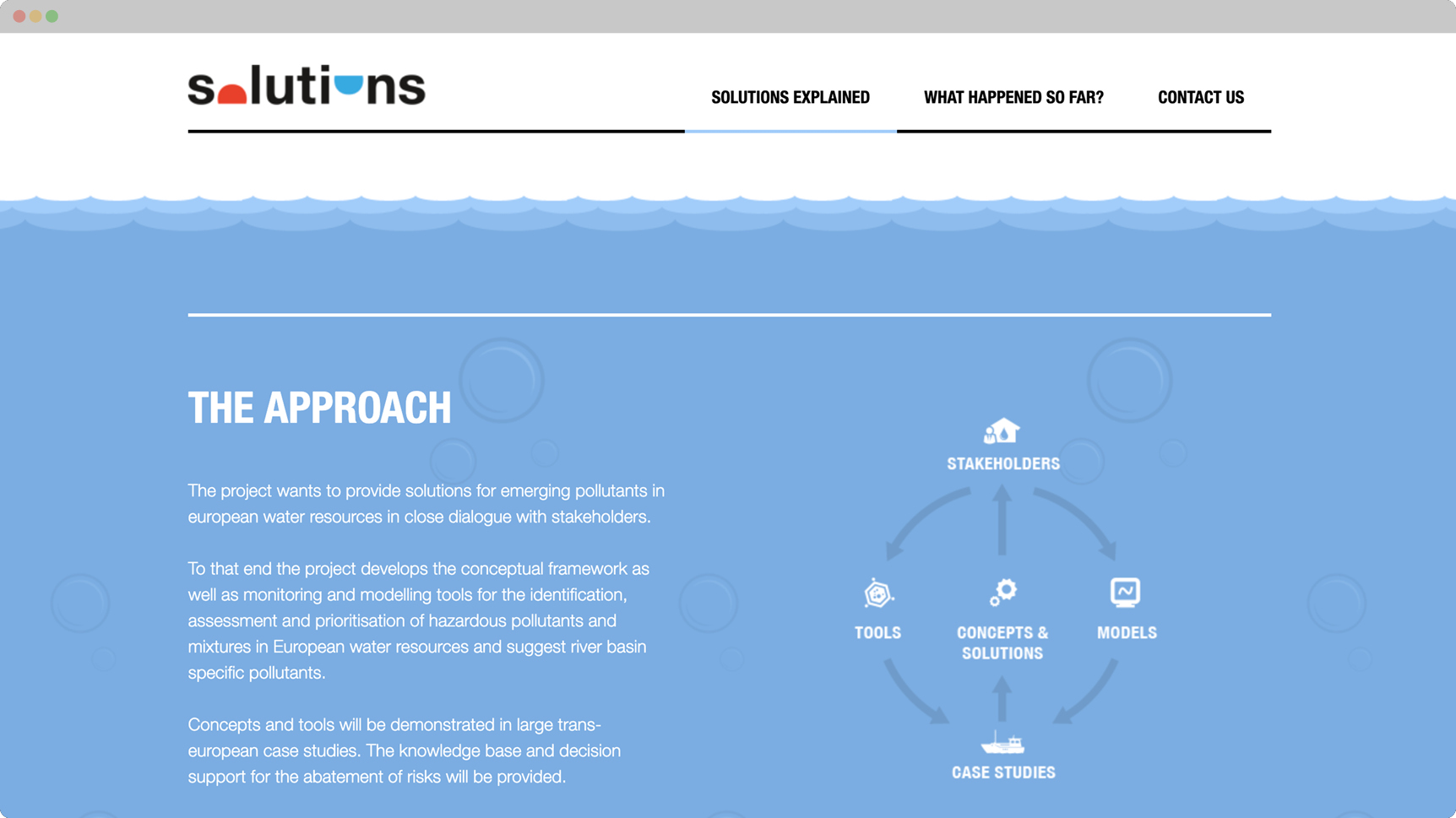 Das EU-Projekt SOLUTIONS, gehostet am UFZ in Leipzig, forscht an der Qualität europäischer Gewässer. Im Fokus dabei: Schadstoffe und modellierte Entwicklungsprognosen, um Lösungen (»Solutions«!) zu entwickeln, mit denen Chemikalien-Belastungen reduziert werden können. Knapp 40 europäische Institutionen sind daran beteiligt. Wir auch. Nur eben nicht als Wissenschaftler*innen, sondern als Kommunikator*innen. Es geht um die öffentliche Beachtung, die erfolgreiche Präsentation gegenüber Stakeholdern und um leichte, wirksame und zeitgemäße Kommunikation der Projektpartner*innen untereinander.